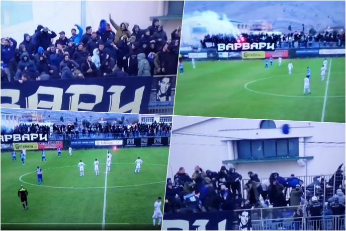 Posle intervencije policije, gostujući "varvari" počeli su da beže oko terena, da bi potom počeli da ubacuju i kamenice na delove tribina na kojima je i dalje bila prisutna publika. Tenzije su se prelile i na teren, pa je golman Budućnosti Pavličić zadobio udarac u glavu.