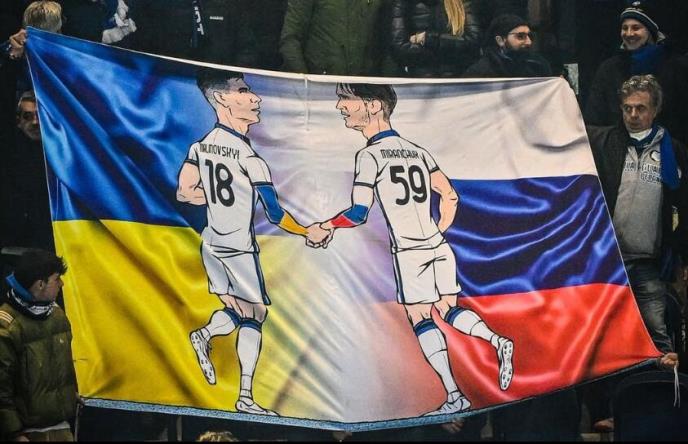 Tifozi Atalante razvili su transparent na kojem se vide ukrajinski fudbaler Rusan Malinovski i ruski igrač Aleksej Mirančuk kako se rukuju! U pozadini su zastave njihovih zemalja koje su trenutno u sukobu.