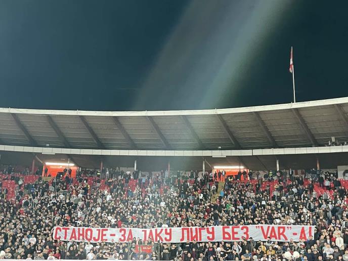 "Stanoje - za jaku ligu bez VAR-a", pisalo je na transparentu, sa jasnom porukom koja asocira na zalaganje šefa struke Partizana da neće dozvoliti da njegov tim igra ako nema VAR-a, pogotovo u večitom derbiju, ali je nedavno na to pristao na prvenstvenom meču sa TSC-om u Humskoj ulici, gde su gosti bili oštećeni za jedanaesterac.