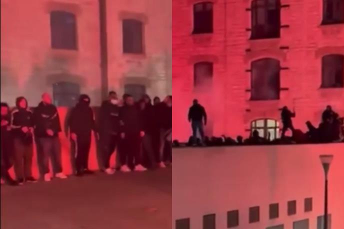 Na jednom od snimaka se vidi grupa navijača koja je saterana u ćošak čeka napad protivničke grupe huligana.