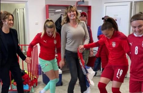 Posle istorijskog uspeha u svlačionici je usledila prava fešta, a srpskim fudbalerkama pridružila se i poznata pevačica Snežana Babić Sneki.