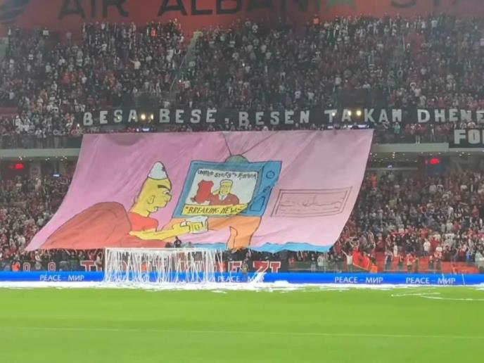 Tokom intoniranja himne Albanije, domaći navijači su raširili veliki transparent sa karikaturom Albanca, urađenog po ugledu na crtanog junaka Barta Simpsona iz popularnih "Simpsonovih", dok gleda televiziju a na ekranu se u tom trenutku vide obeležja Velike Albanije.