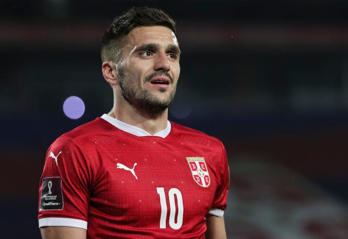 Na slici su predstavljeni kapiteni Srbije i Švajcarske, Dušan Tadić i Granit Džaka - zagrljeni.