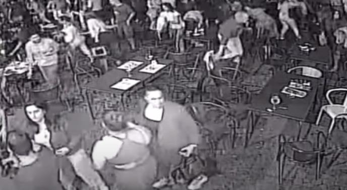 Na snimcima se vide ljudi kako ustaju i beže iz kafića dok grupa zamaskiranih, većinom obučenih u crno navijača, nasrće bacajući stolice i baklje.