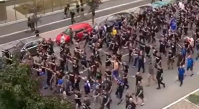 Naime, na društvenim mrežama se pojavio snimak na kom se jasno vidi kako više desetina hrvatskih huligana, dok šeta u korteu ka stadionu San Siro, salutira prepoznatljivim nacističkim pozdravom i peva navijačku pesmu "Ja volim samo Dinamo" uz melodiju "Lili Marleen".