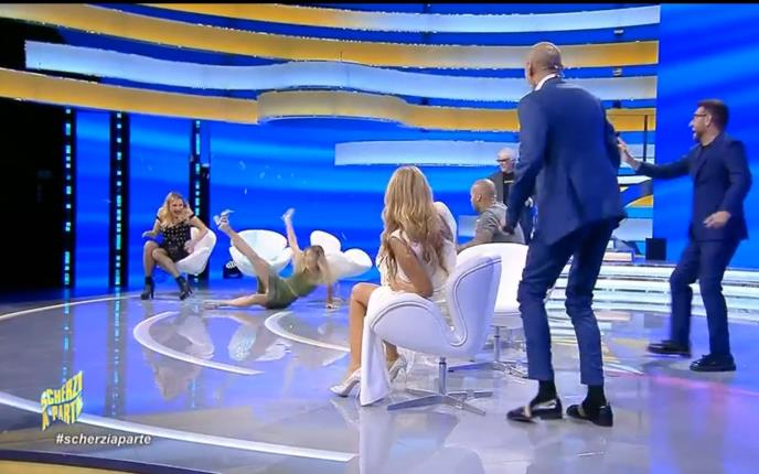Potom je krenula u obračun sa voditeljima emisije, ali je doživela peh - okliznula se o tu istu tečnost i završila na patosu.