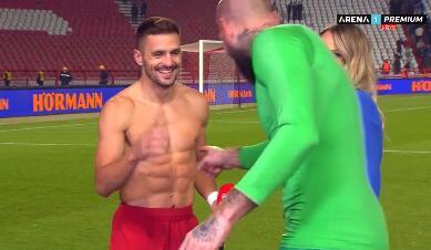 Nakon izuzetno važne pobede naše reprezentacije nad Crnom Gorom u kvalifikacijama za Evropsko prvenstvo (3:1) Dušan Tadić raspametio je pripadnice nežnijeg pola, pošto se pred kamerama TV Arene pojavio go do pojasa, pa su u prvom planu bili njegovi pakleni trbušnjaci.