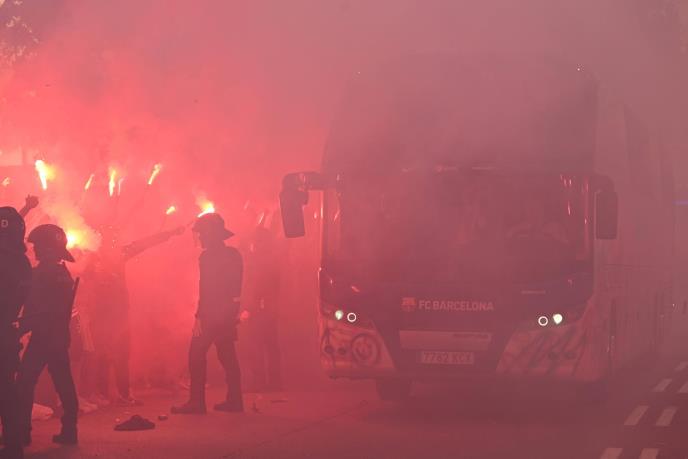 Međutim, u opštoj gužvi i slaboj vidljivosti koju je stvorila dimna zavesa od baklji, domaći navijači su greškom kamenovali autobus sa igračima Barselone! Nekoliko desetina kamenja i flaša pogodilo je autobus, srećom bez većih posledica.