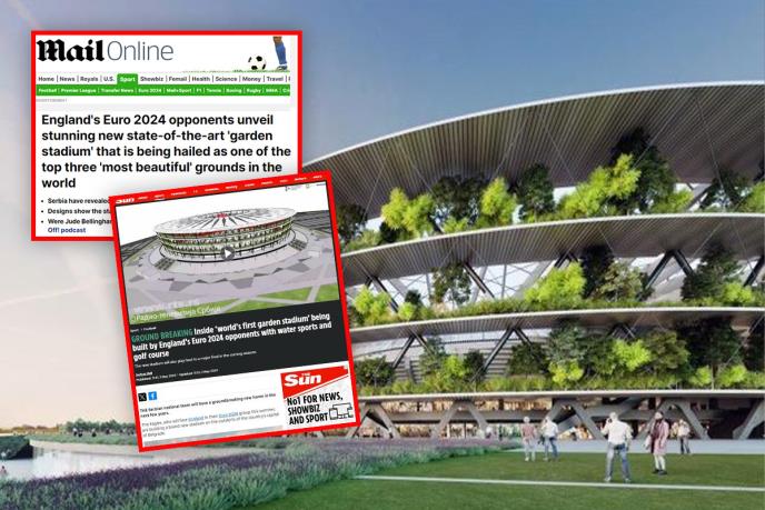 - Srbija je otkrila novi ambiciozni plan da izgradi remek-delo od fudbalskog stadiona. Biće to prvi stadion sa elementima "bašte" ili "vrta", jer će imati i drveće i zelenilo. Predstavljen je veličanstven plan za izgradnju stadiona na periferiji srpske prestonice, Beograda, koji se može pohvaliti novim dizajnom, koji uključuje ekološki pristup - navedeno je u tekstu engleskih novinara.