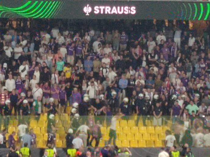 U finišu prvog poluvremena finala Lige konferencije između Olimpijakosa i Fjorentine viđen je haos na tribinama stadiona u Atini.