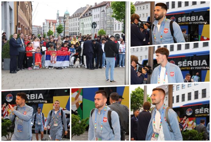 Austobus sa fudbalerima Srbije stigao je ispred hotela na opšte oduševljenje desetina navijača koji su se okupili da ih pozdrave i požele im sreću na predstojećem šampionatu. Najveće ovacije, očekivano, dobio je Aleksandar Mitrović koji je pozdravio prisutne.
