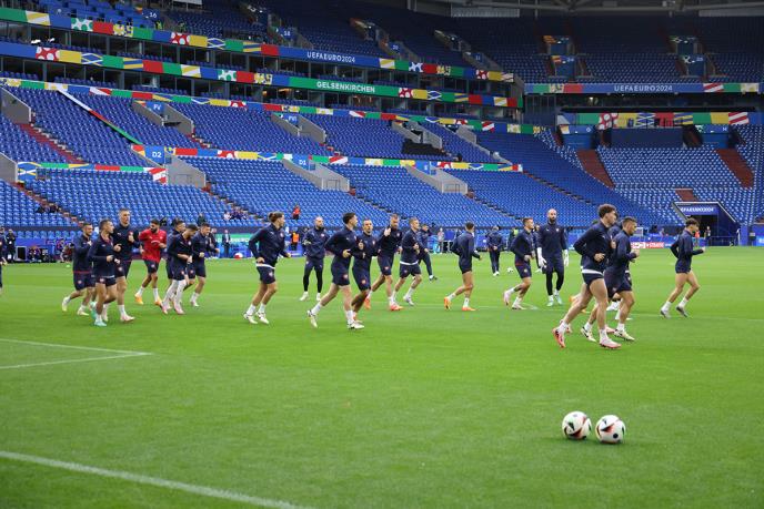 Fudbaleri Srbije su istrčali na teren u Gelzenkirhenu gde su trenirali pred meč sa Engleskom koji je na programu sutra od 21 čas.