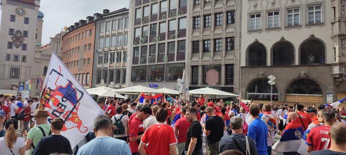 Navijači reprezentacije Srbije i Slovenije napravili su fantastičnu atmosferu na trgu Marijenplac u Minhenu.