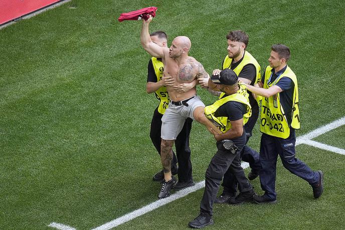 Pri vođstvu Slovenije od 1.0, jedan navijač je uleteo na teren.