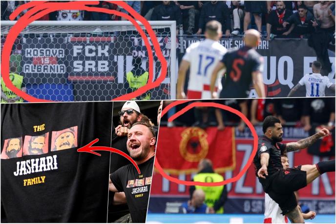 Pevalo se protiv Srbije, sramotni transparenti i zastave dominirale su na tribinama. Albanski navijači su istakli parolu protiv Srbije na kojoj piše "FCK SRB".