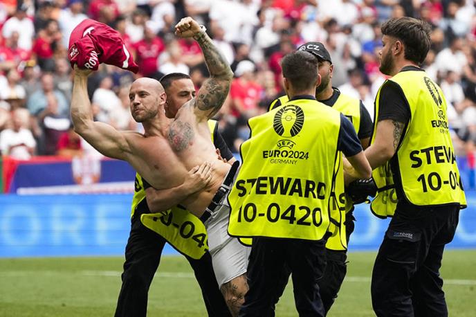Jučerašnji meč između Srbije i Slovenije na Evropskom prvenstvu prekinut je u jednom momentu pošto je jedan navijač utrčao na teren.