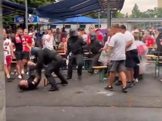 Jedan alkoholisani navijač je pokušao da se pravi pametan, bacio je flašu na , policajca, a dobio je instant nokaut.