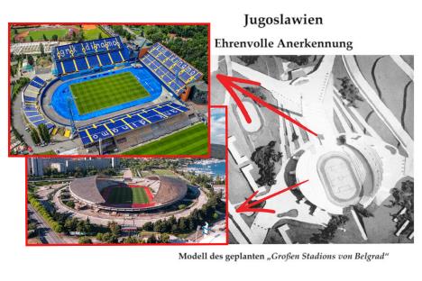 Prvi je bio duboko kontroverzni plan za Političko-sportski stadion u zoni Donjeg grada na Kalemeganu koji ne samo da je predviđao razaranje stare beogradske tvrđave već je neprijatno podsećao na predratni projekat nacista predložen Beogradu pre njihove agresije, 1940. godine. Jer, i ta naci ideja je predviđala "raščišćavanje" vekovne istorije zarad sportskih terena.
