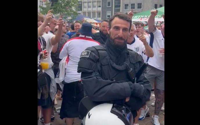 Simpatizeri reprezentacije Gordog albiona pred meč sa Holanđanima (2:1) pali su u ekstazu. Naime, vidno pod uticajem alkohola, navijači Engleske snimili su ispred stadiona u Dortmundu jednog policajca, koji svojim izgledom neodoljivo podseća na njihovog selektora Gareta Sautgejta.