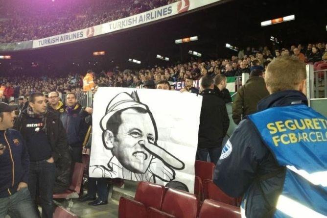 Transparent sa Roselom kao Pinokiom nije se dugo zadržao na tribini stadiona Nou Kamp, pošto su redari odmah intervenisali i uklonili ga.