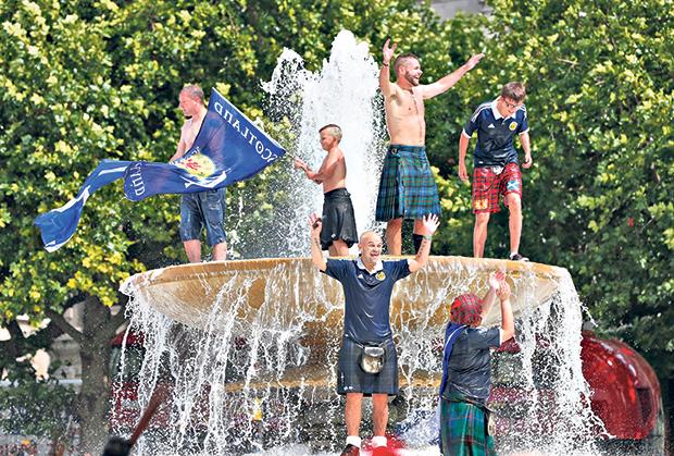 Najvatrenije pristalice Škotske su ceo dan pevali, pili i zabavljali se u strogom centru Londona, a najbolja zanimacija bila im je uriniranje u popularnu fontanu, u koju su prethodno sipali velike količine deterdženta