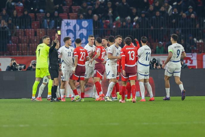 Fudbaleri Srbije su odmah pritrčali, kao i Švajcarci te se na terenu za tili čas stvorila velika gužva.