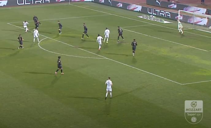 Ponovo je Tomović napravio problem defanzivcima Partizana koji mu očigledno ne mogu ništa, namestio je sebi prostor za šut, fantastično opalio po lopti sa nekih 17 metara i pogodio dalji ugao za 2:0. Jovanović se ispružio koliko je mogao, ali ovakav udarac se jednostavno ne brani!