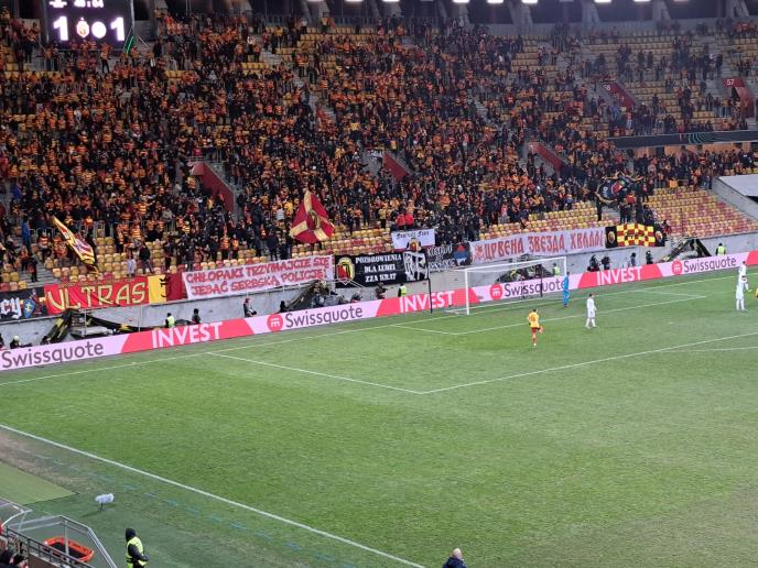 Posvetili su Poljaci i treći transparent Srbima, ovaj put veliku zastavu na kojoj piše "Kosovo je Srbija" na poljskom jeziku i mapu Kosova i Metohije u bojama srpske zastave crveno-plavo-belo.