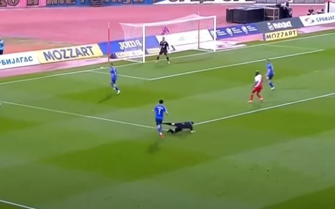 Naravno, nije bilo namere, Jeknić se okliznuo u nezgodnom momentu, pa je fudbaler morao da izbegne njegove noge, a srećom nije došlo do problema prilikom te situacije.