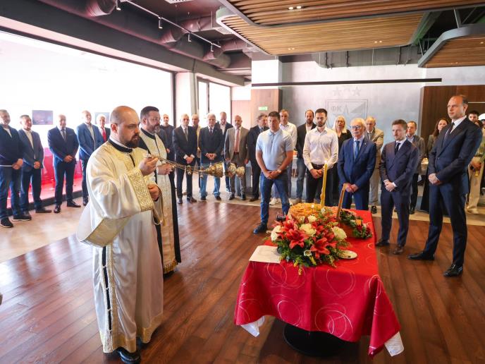 Sveštenstvo iz Hrama Svetog Save protojerej Dragan Šovljanski i protođakon Mladen Kovačević su u prostorijama stadiona uz molitvu ispoštovali slavske običaje.