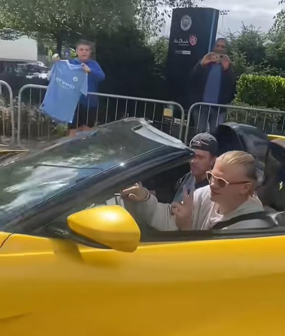 Navijači su se okupili ispred Sitijevog trening centra i aplaudirali dok je Norvežanin koji zarađuje 500.000 funti (oko 590.000 evra) nedeljno, ubrzavao u novom Ferariju 812 Superfast kabrioletu.