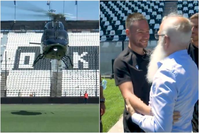 Savidis je helikopterom sleteo na teren na stadionu "Tumba" gde su ga dočekali trener Razvan Lučesku i fudbaleri crno-belih iz Soluna.