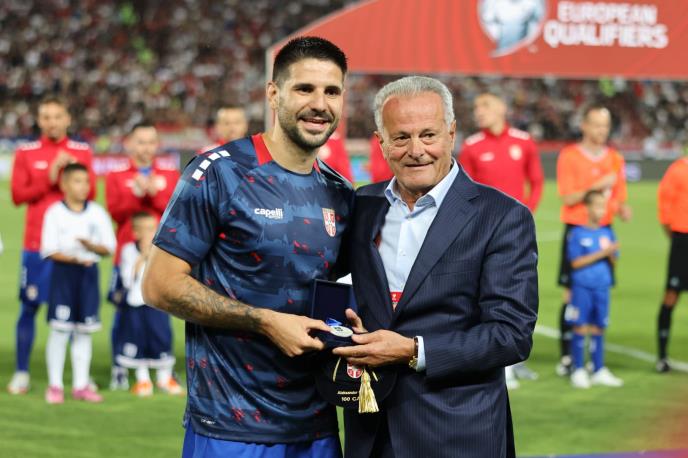 Reč je o specijalnoj medalji - tradicionalni poklon koji UEFA šalje da se na prvoj domaćoj utakmici uruči svakom igraču koji zabeleži 100 nastupa u drzavnom timu, a Stevan Stojanović mu je uručio i specijalni poklon u ime "A" reprezentacije Srbije.