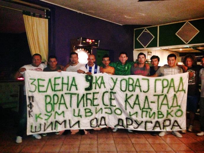 Na transparentu je napisano: "Zelena 9-ka u ovaj grad vratiće se kad-tad." Reč je o poruci koja je upućena Nikoli Šimuliji, igraču Petrove Gore koji se uskoro ženi i odlazi iz kluba, a samim tim zatvara i kafić koji je držao u Vojniću.