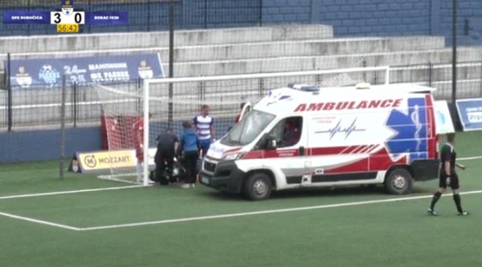 Ubrzo su kola hitne pomoći ušla na igralište i odvezla golmana u bolnicu.
