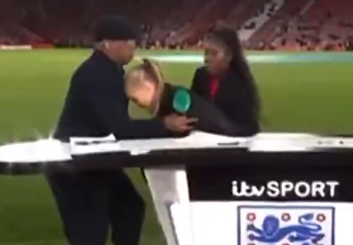 Dobrom reakcijom legendarog fudbalera Iana Rajta, koji je bio sagovornik, voditeljka je izbegla pad na zemlju i potencijalne povrede.