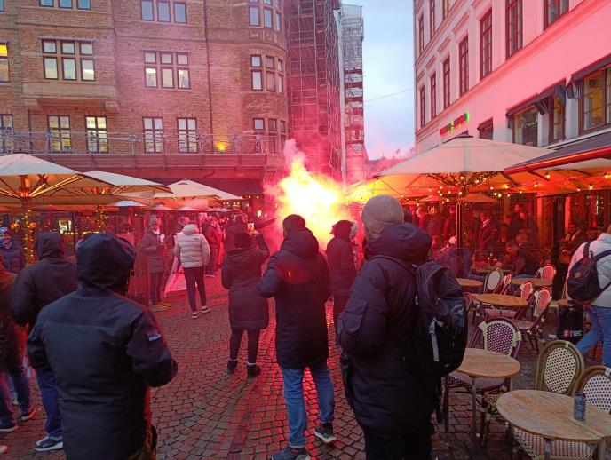 Švedska policija mirno posmatra sve šta rade Delije, koji se nalaze na trgu i u okolnim kafićima i pabovima. Čuju se pesme o Crvenoj zvezdi, koje se smenjuju jedna za drugom. Nekoliko policijskih marica raspoređeno je na rubnim delovima trga Lila, ali zasad nema specijalnih snaga organa reda u velikom broju. Očekuje se da pristignu kada korteo krene ka stadionu.
