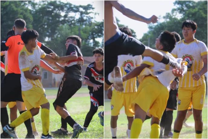 Radi se o niželigaškoj utakmici, a u prvom planu je fudbaler koji je krenuo da brani saigrača. On se zaleteo i u skoku brutalno sa leđa šutnuo protivničkog fudbalera.