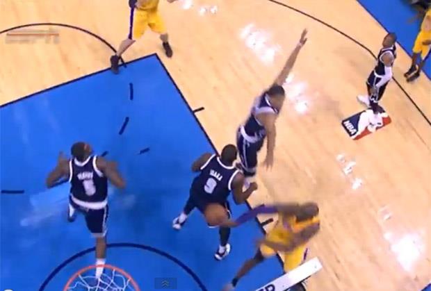 Bek "Jezeraša" se zavukao u reket domaćina i u gotovo izgubljenoj situaciji snašao se na neobičan način. Brajant je udario loptu o donji deo leđa igrača Oklahome Ibake, a ona se odbila do Džordana Hila koji je lagano poentirao.
