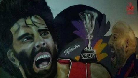 Na muralu, koji je završen uoči početka utakmice, vidi se Teodosić i selektor Đorđević sa pobedničkim peharom.