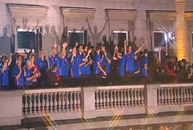 Prvi su na balkon izašli članovi rep grupe THC koji su posvetili košarkašima hit "Igraj i pobedi".