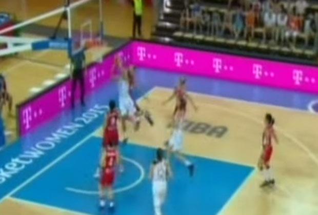 SOMBATELJ - Košarkašica Srbije Danijel Pejdž napravila je sjajnu blokadu na meču protiv Letonije u meču prvog kola grupe C na Evropskom prvenstvu u Mađarskoj.