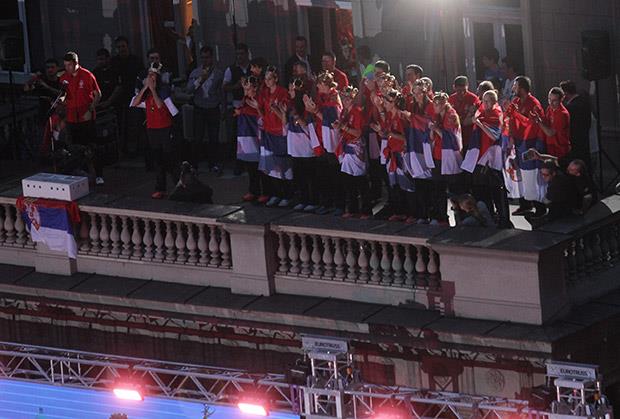 Članice ženske košarkaške reprezentacije Srbije koja je u nedelju postala šampion Evrope, pozdravljene su od strane 20 hiljada navijača sa balkona Skupštine grada Beograda.