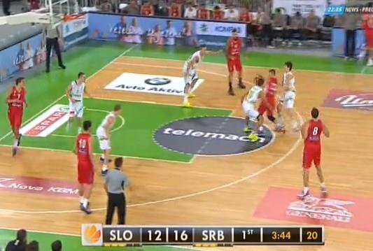 Srbija je na samom startu duela povela sa 7:3 posle veoma agresivne igre u odbrani i zahvaljujući sedam uzastopnih poena Bjelice. U finišu prve četvrtine razigrao se i Raduljica i povisio na 20:14. Sa dve uzastopne trojke Slovenci su do isteka 10. minuta ipak uspeli da uhvate rezultatski priključak - 22:20. U nastavku utakmice vodila se izjednačena borba u kojoj su srpski reprezentativci iako prilično bolji u skok igri samo održavali minimalnu prednost - 30:28 (15. minut). Usledile su međutim dobre akcije Nedovića i Milosavljevića, kao i poeni sa linije slobodnih bacanja Bjelice i Bogdanovića za dvocifreno vođstvo - 40:28 u 18. minutu. Do kraja prvog poluvremena srpski reprezentativci nisu poentirali, a Slovenci su serijom 5:0 smanjili zaostatak - 40:33.