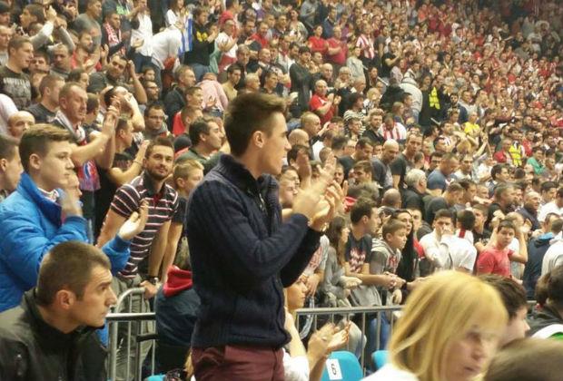Đorđe je u društvu devojke Tijane iz prvih redova posmatrao duel srpskog šampiona i ekipe koju sa klupe predvodi Željko Obradović.