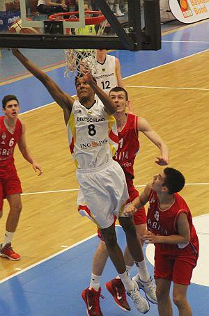 Prvo poluvreme proteklo je u potpuno izjednačenoj igri, što potvrđuje i sam rezultat. Igralo se dosta čvrsto na obe strane. Posle startnog vođstva Nemaca 4:0, naš tim je odgovorio serijom 10:0, ali se na prvu pauzu otišlo u egalu – 16:16. Ista priča bila je i u drugoj deonici. Srbija je imala od jednog do pet poena viška, ali su domaći stalno stizali i bili na korak do vođstva, zahvaljujući sjajnom Mušidiju (25 poena, 11 skokova).