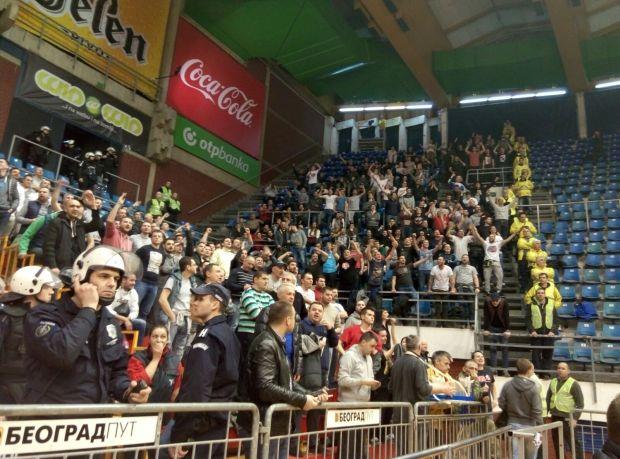 Navijači Partizana koji su provocirali Delije su izbačeni iz dvorane, a Žandarmerija je pojačala kordone oko navijača Zvezde.