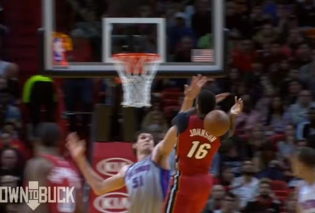 Srpski centar Boban Marjanović sjajno je izblokirao košarkaša Majamija Džejmsa Džonsona.