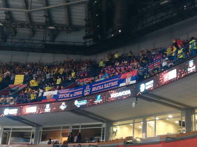 Za sada je u "Areni" nekoliko stotina navijača CSKA, koji su istakli transparent sa porukom: "Rusi i Srbi braća zauvek", uz zastave obe zemlje.