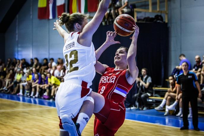 Hrabro su srpske reprezentativke ušle u duel snažnom selekcijom Rusije. Predvođene raspoloženom Teodorom Turudić imale se u dva navrata po pet poena prednosti, ali je rival ipak uspeo dođe do izjednačenja na kraju prve četvrtine- 21:21. Ruskinje su mnogo bolje započele drugi period i povele u 13. minutu sa 30:23. Rivala je krenuo i šut za tri poena, tako da je ubrzo stekao i 15 poena prednosti – 40:25. Do kraja prvog poluvremena naš mladi tim nije uspeo da smanji zaostatak – 48:33.